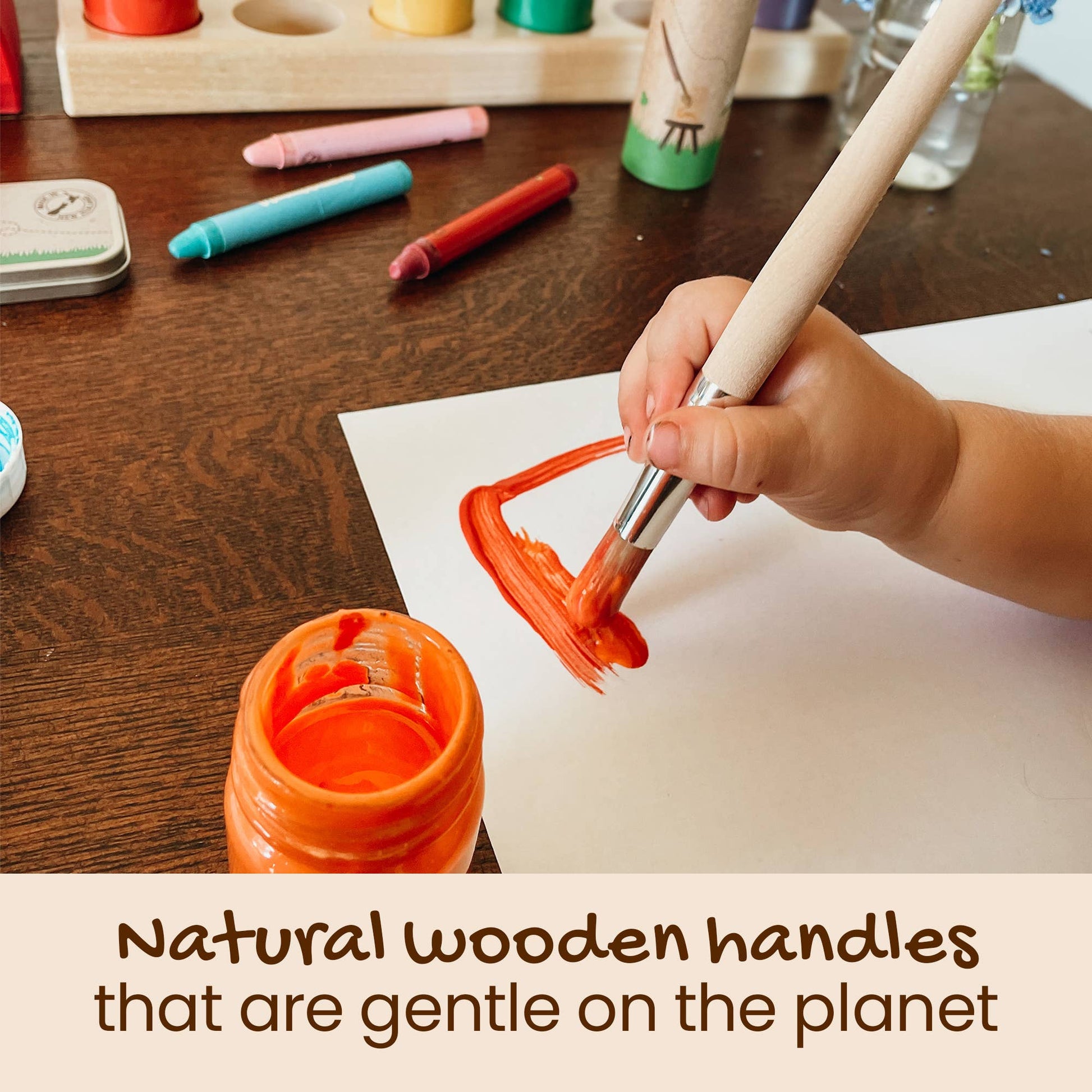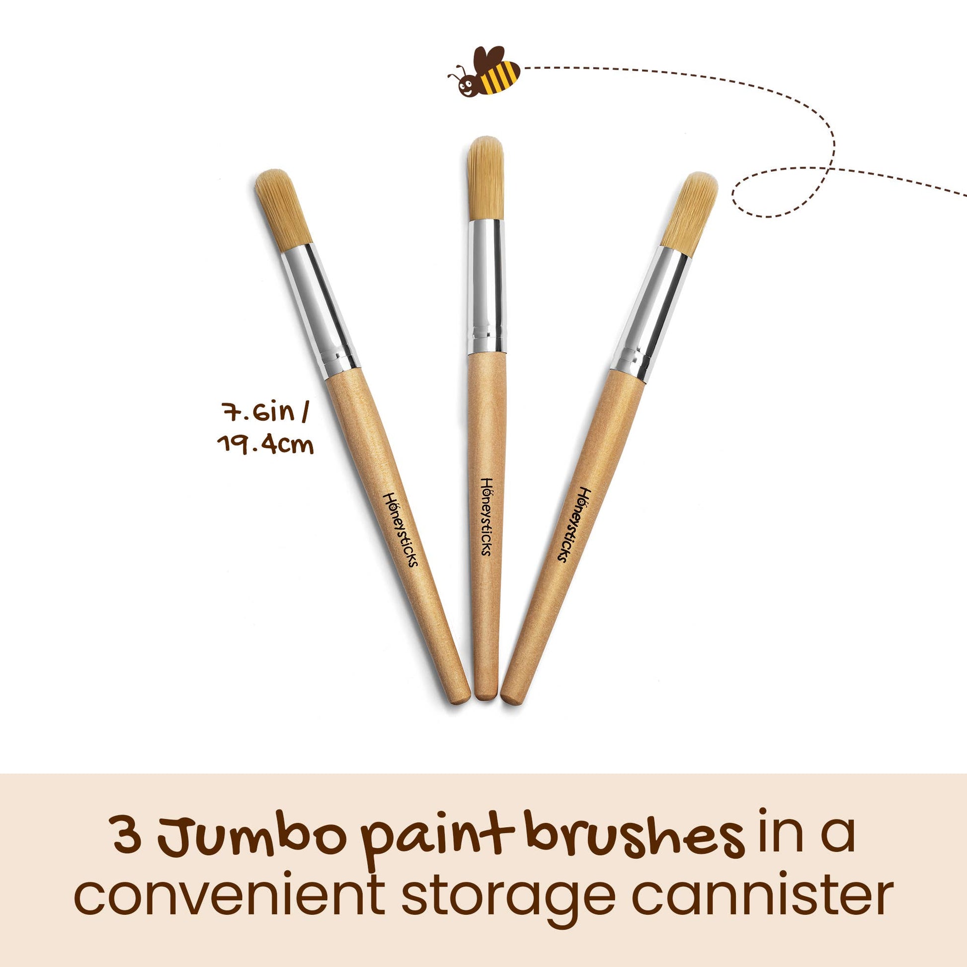 Honeysticks Jumbo Paint Brush set comes with 3 Jumbo Paint brushes with long thick natural wooden handles that are easy for little hands to hold and use.